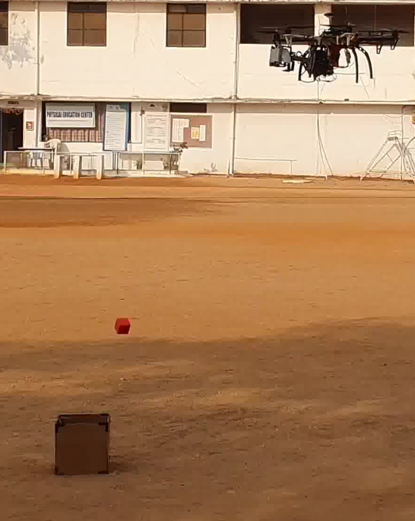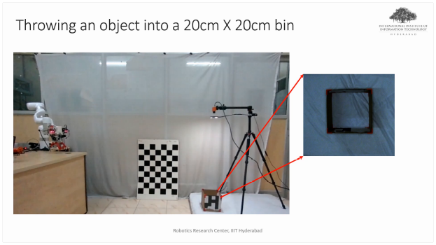 Targeted throwing manipulation: into a 20cm x 20cm bin using an industrial robotic arm (left) and from an aerial drone hexacopter outdoors (right).